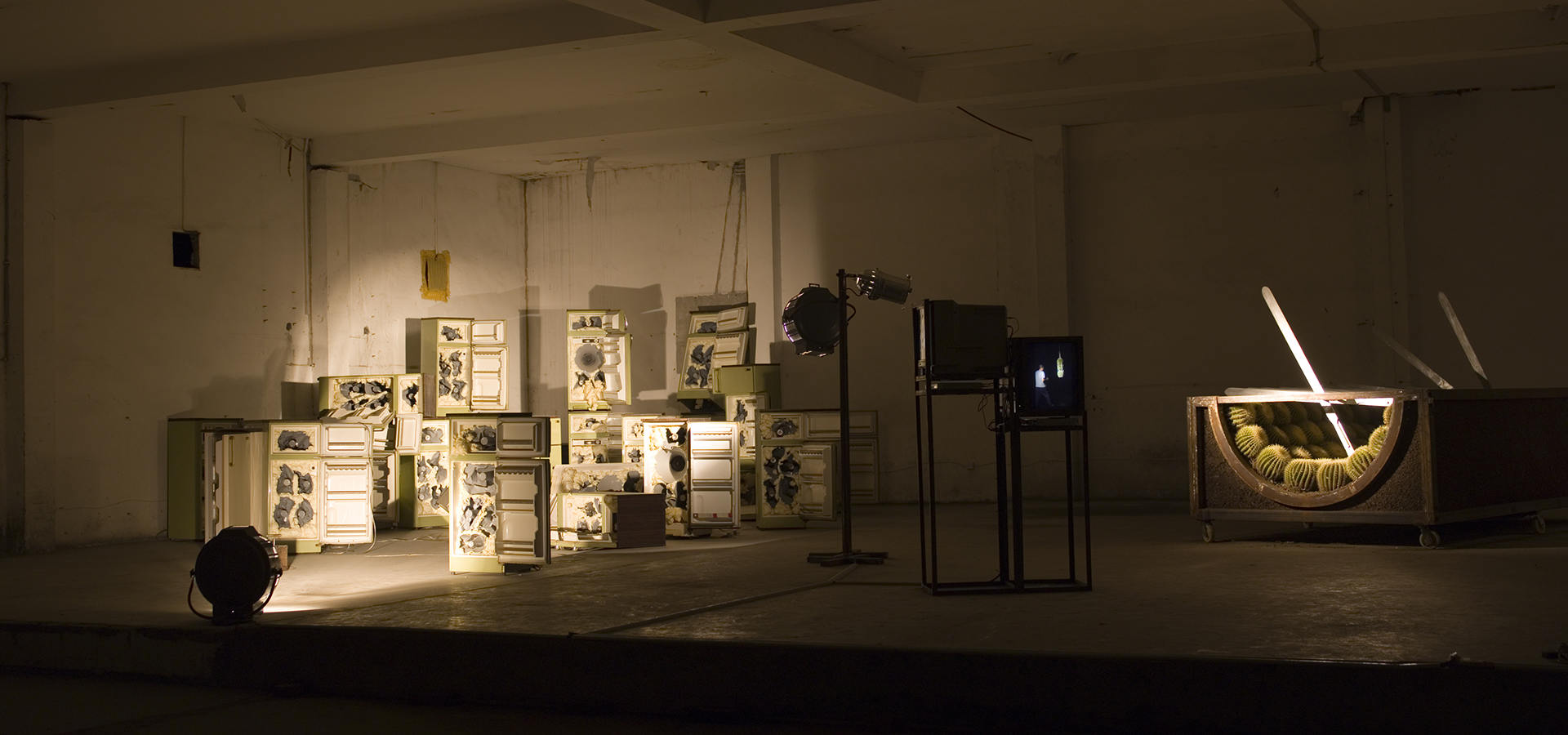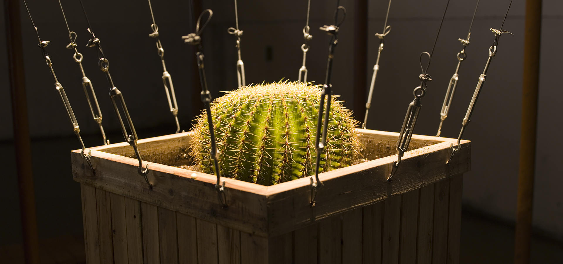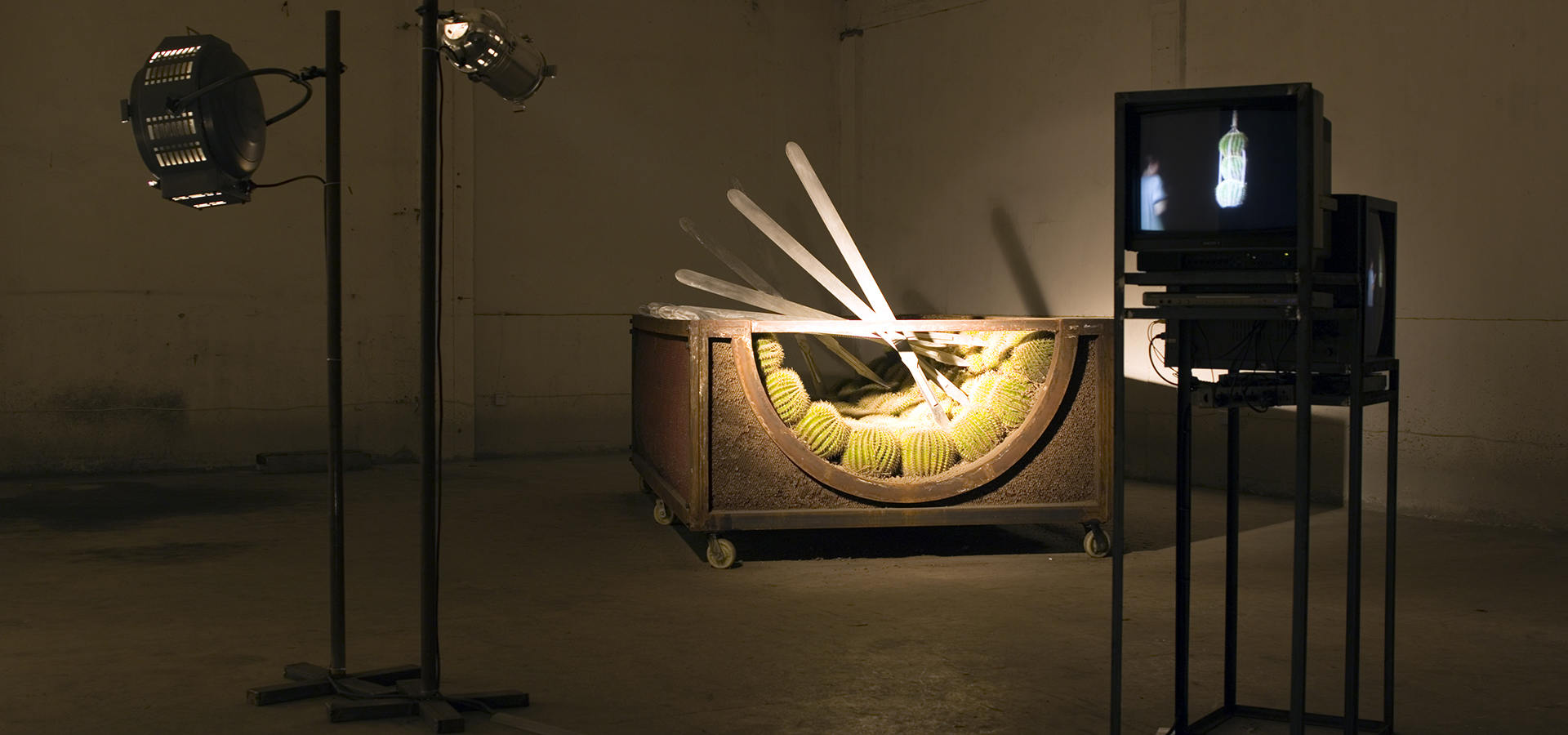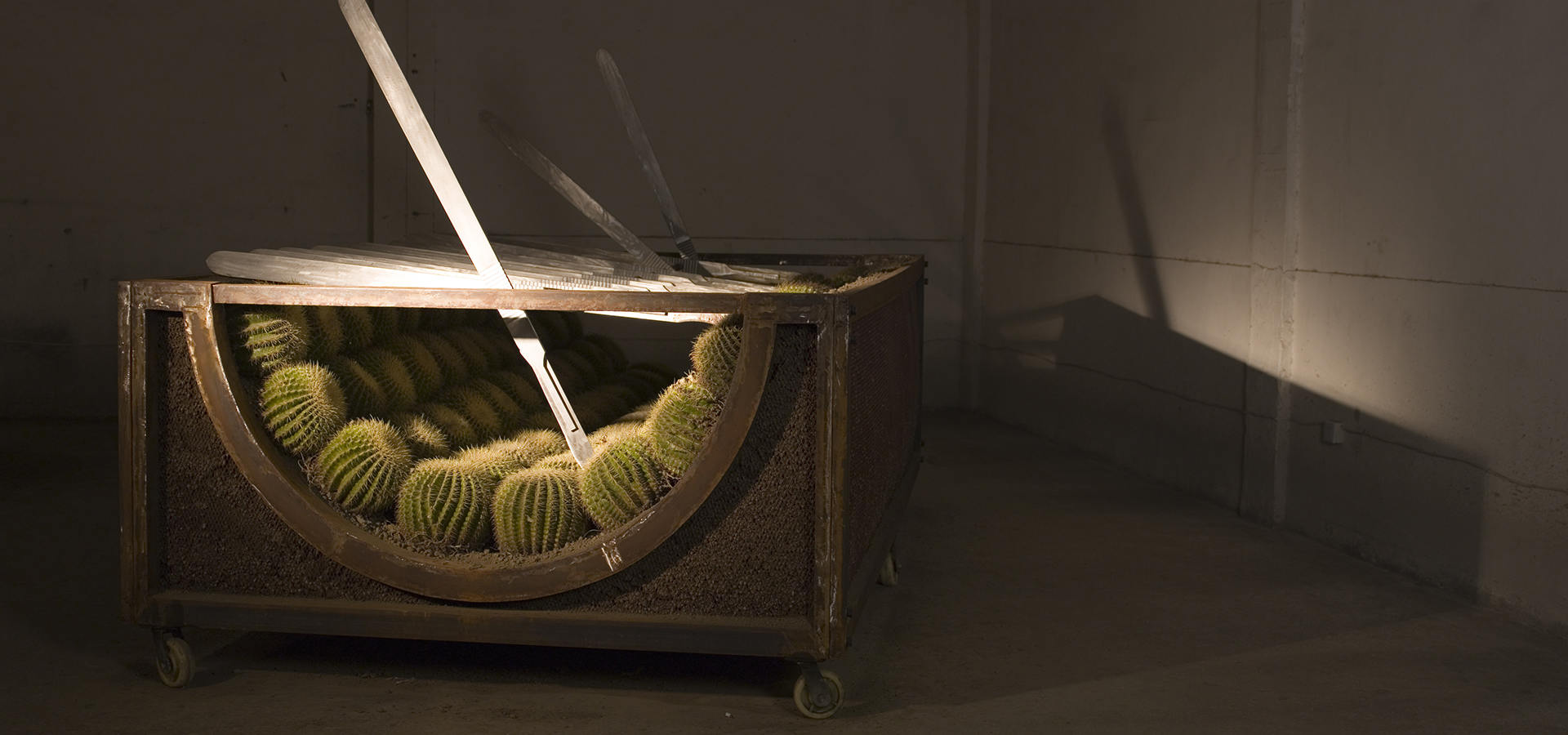《工具》是一个为边缘世界所创造的寓言幻境。仙人球在这里成为了主要的道具/工具,似隐喻低贱而顽强的生命。这种植物处处可见,多刺令人只可远观。艺术家反其道而行,试图寻找能与此生命沟通的途径:暴力抑或对话。无论是怵心的拳击,还是冰冷的利器切割,对仙人球来说,最具破坏力的则是看上去最唯美的水。十条水柱从上倾泻而下,划出道道抛物线,浇落于仙人球盆栽上,花泥飞溅、水泻满地。与仙人球系列相对的是一组非自然的工业产物,24台暗绿色的老式电冰箱内挤满了老式高音喇叭,加上一个老式的引爆器可以人为激发震耳发聩的爆炸声,让你恍然间如身置“恶之花”的世界之中。