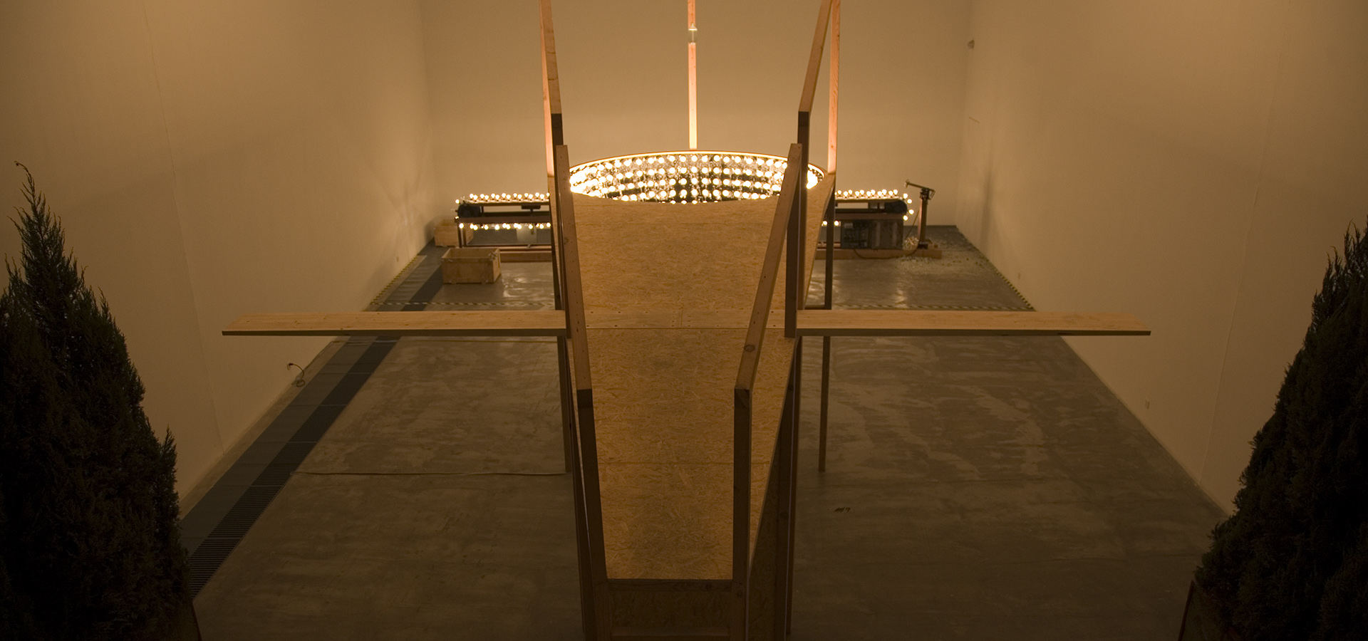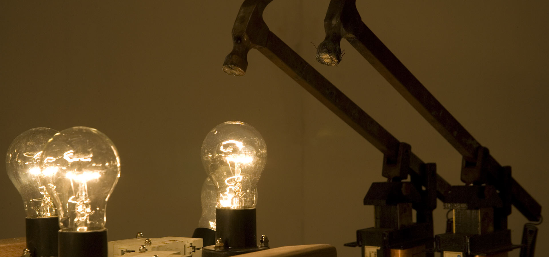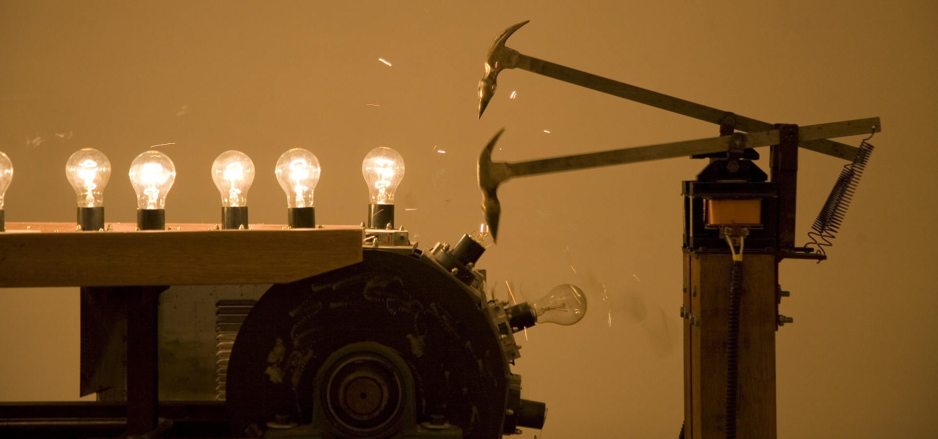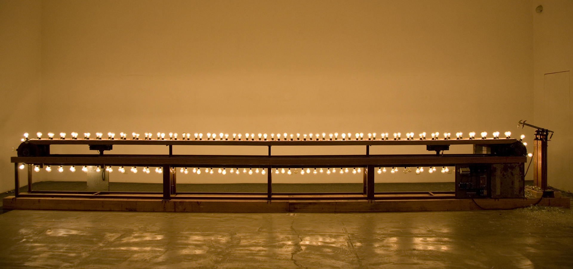 另一件长8米的机械传送装置。其上安插的上百个灯泡依序进退,等待它们的却是两端无情的铁锤。它们与那高高在上的灯泡们遥相呼应,并以自我牺牲平复躁动与贪婪。在此,破坏是达到平衡的方式。艺术家似乎在提醒我们,规则与秩序的维护,权力与利益的享有,是否也应遵从一种破立之道?