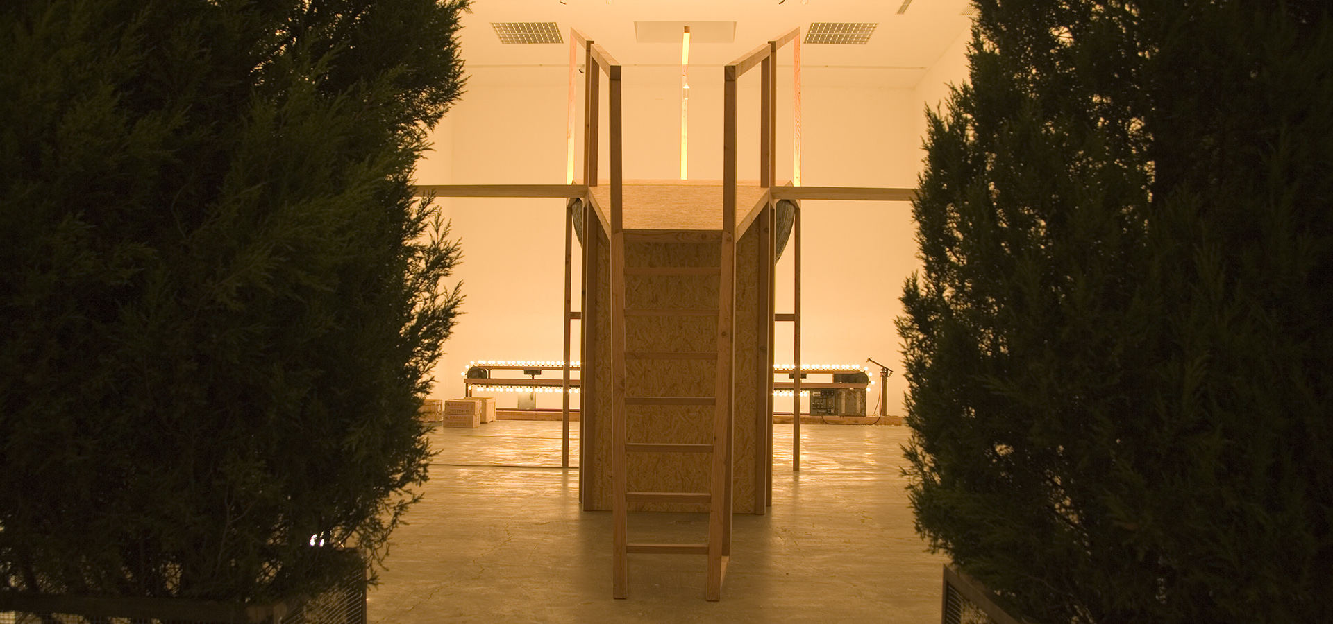 高墙前方的木质灯光装置长7米、高5米。在它前端巨大的半球体中安置有700多个发光灯泡,两侧则是如跳水板一般的双翼。光热会产生无穷的能量,引人向往。而获取能量的唯一方式,只有克服登高恐惧,攀上装置,在似有若无的保护中惴惴前行。这是勇敢者的冒险体验,还是高位者的生存危机?