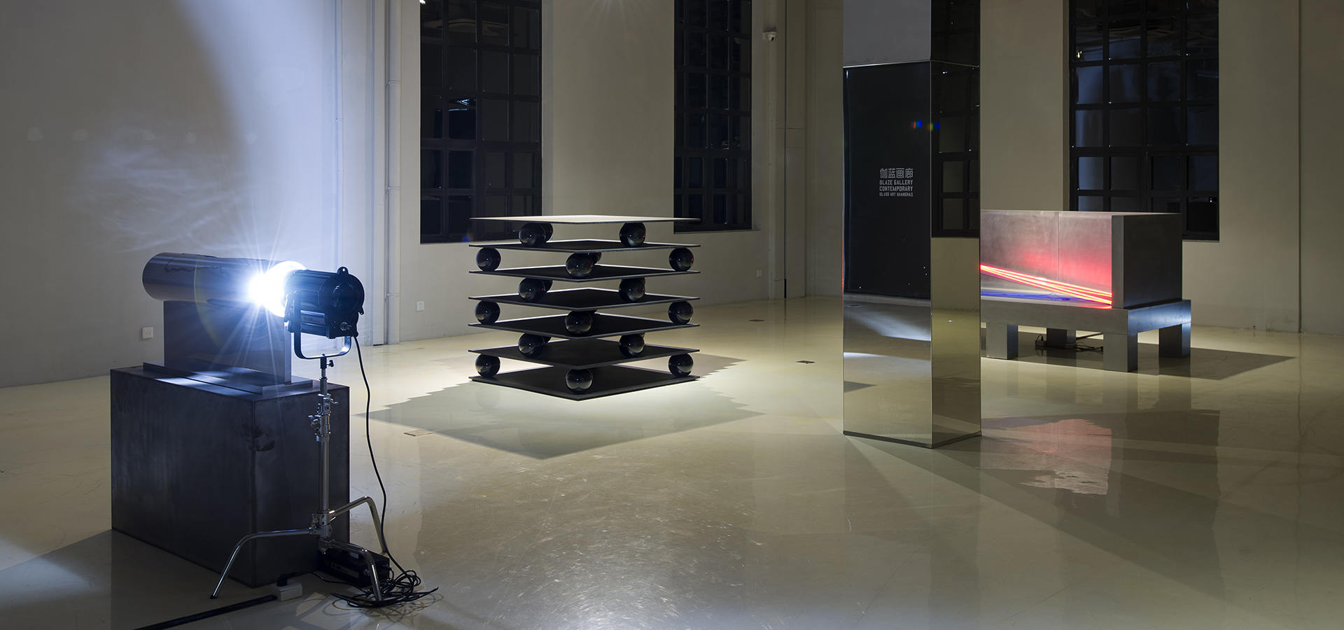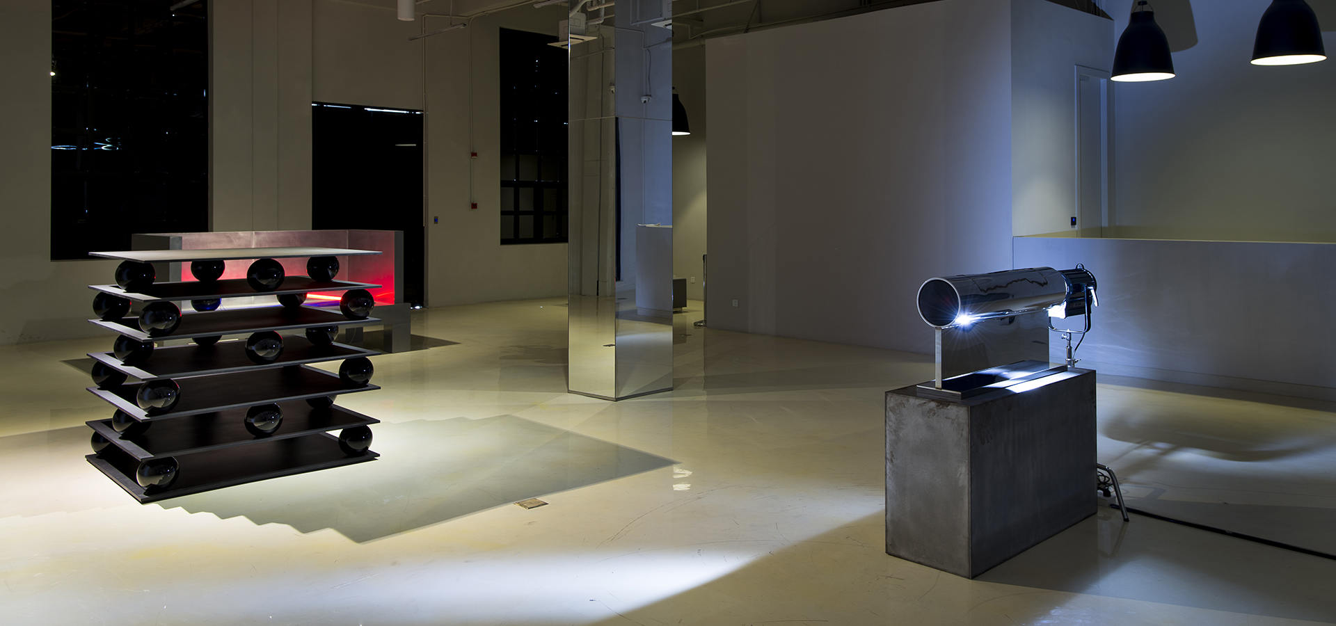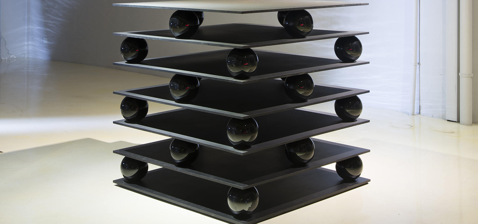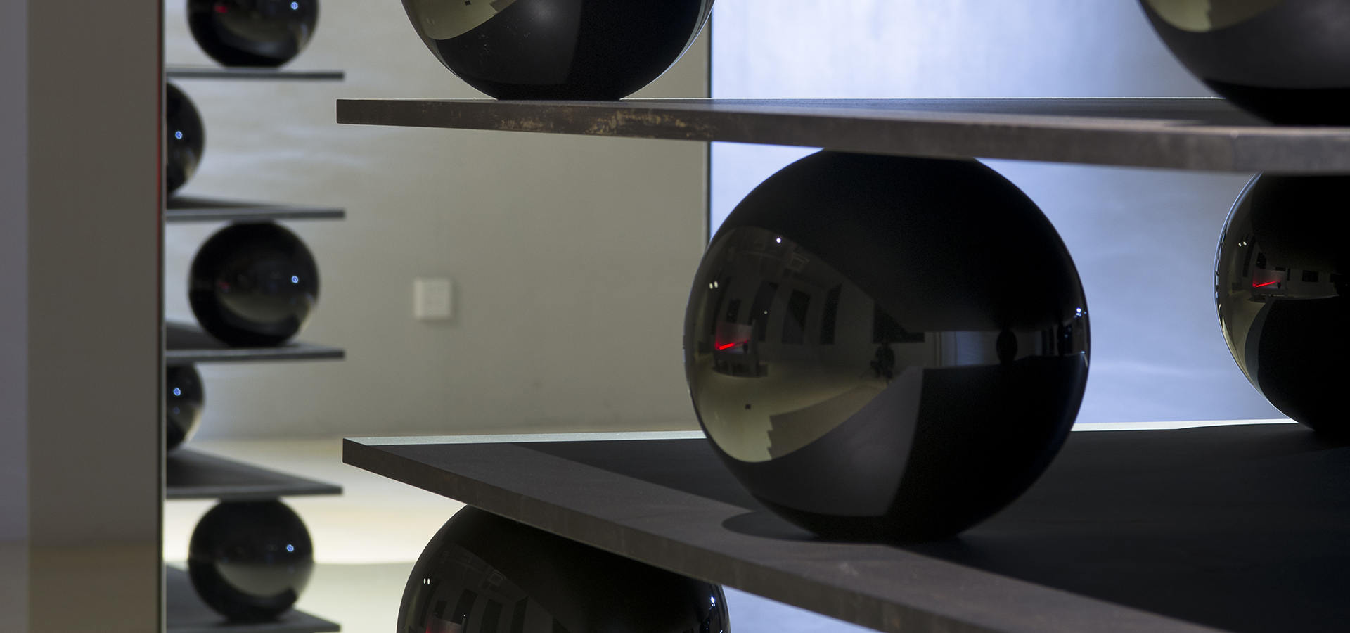 作品以黑色的看不清内部的玻璃球体和黑色钢板构建而成,达成一个的平衡空间。玻璃脆弱通透而致密;钢板冰冷坚硬的物理特性。两种矛盾的材质,在相互挤压中形成一个平衡而危险的空间。