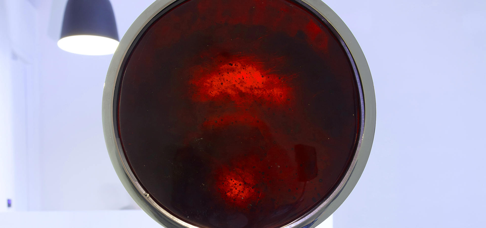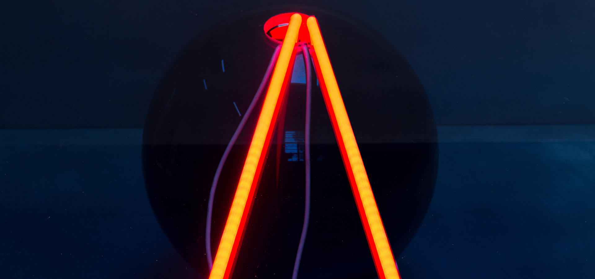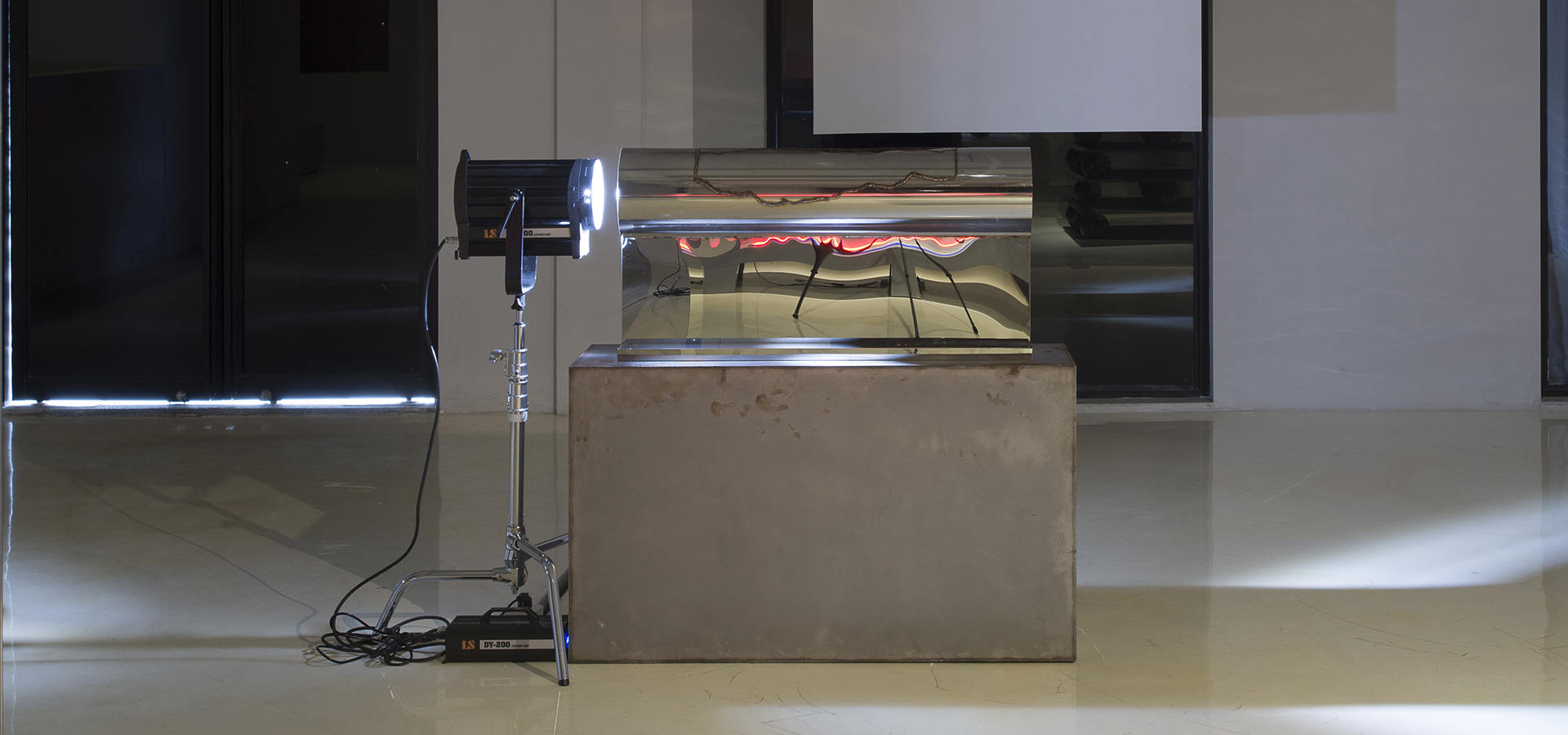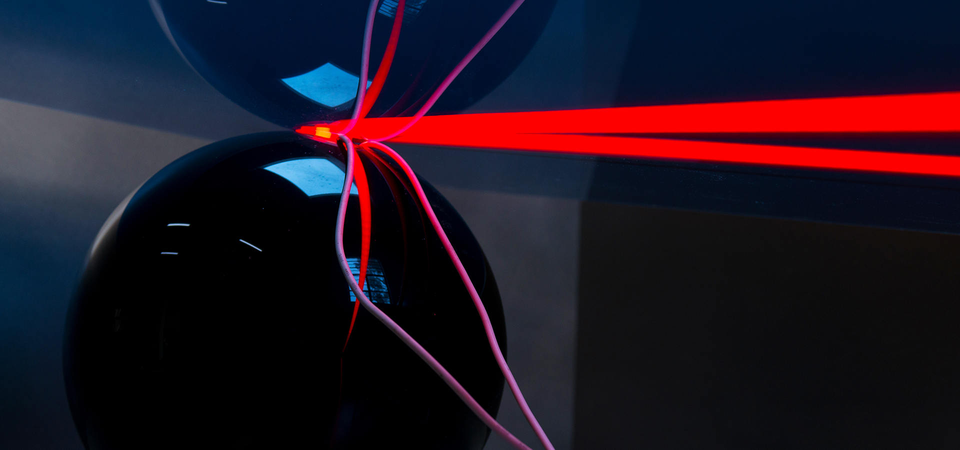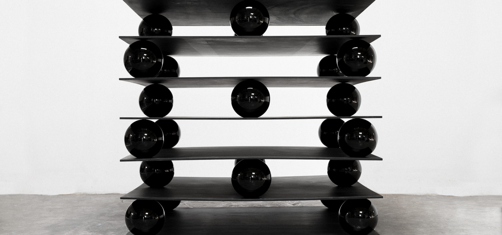 作品以黑色的看不清内部的玻璃球体和黑色钢板构建而成,达成一个的平衡空间。玻璃脆弱通透而致密;钢板冰冷坚硬的物理特性。两种矛盾的材质,在相互挤压中形成一个平衡而危险的空间。