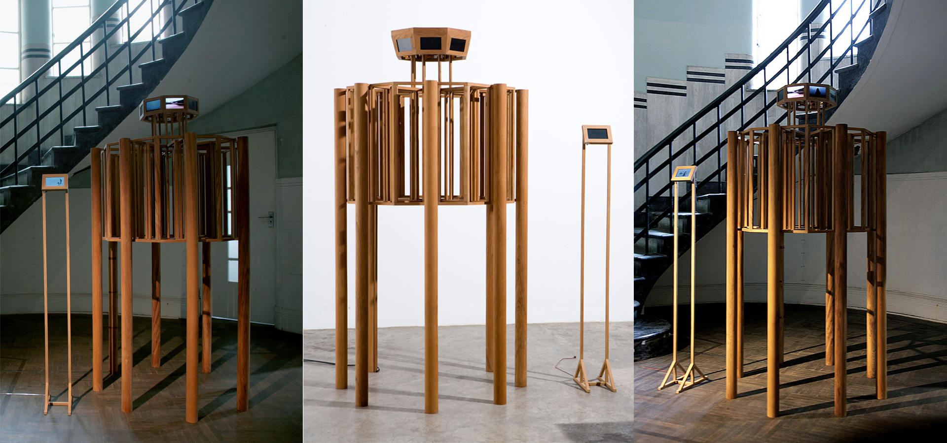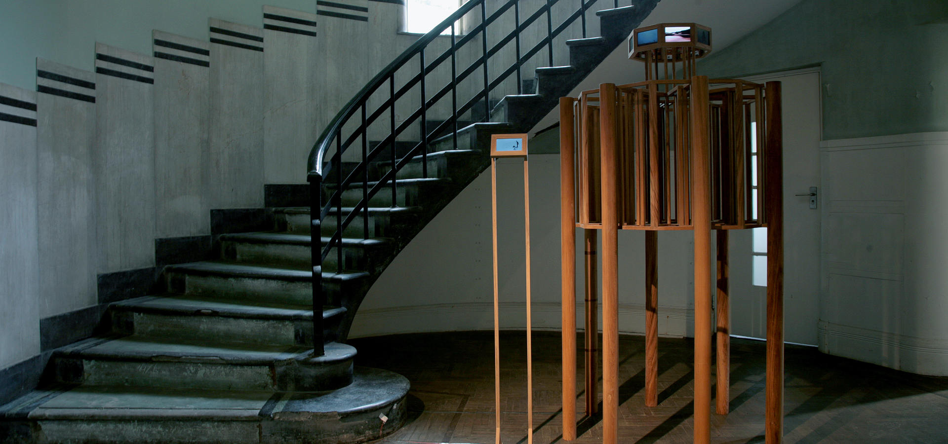 装置是对社会系统和历史的个人理解。从顶部往下看,木结构勾画出8个彼此拉着手的人。8个录像由不同的角色主演,同时,第9个录像呈现了这8个角色和一只正在给他们每个人分配任务的猴子。