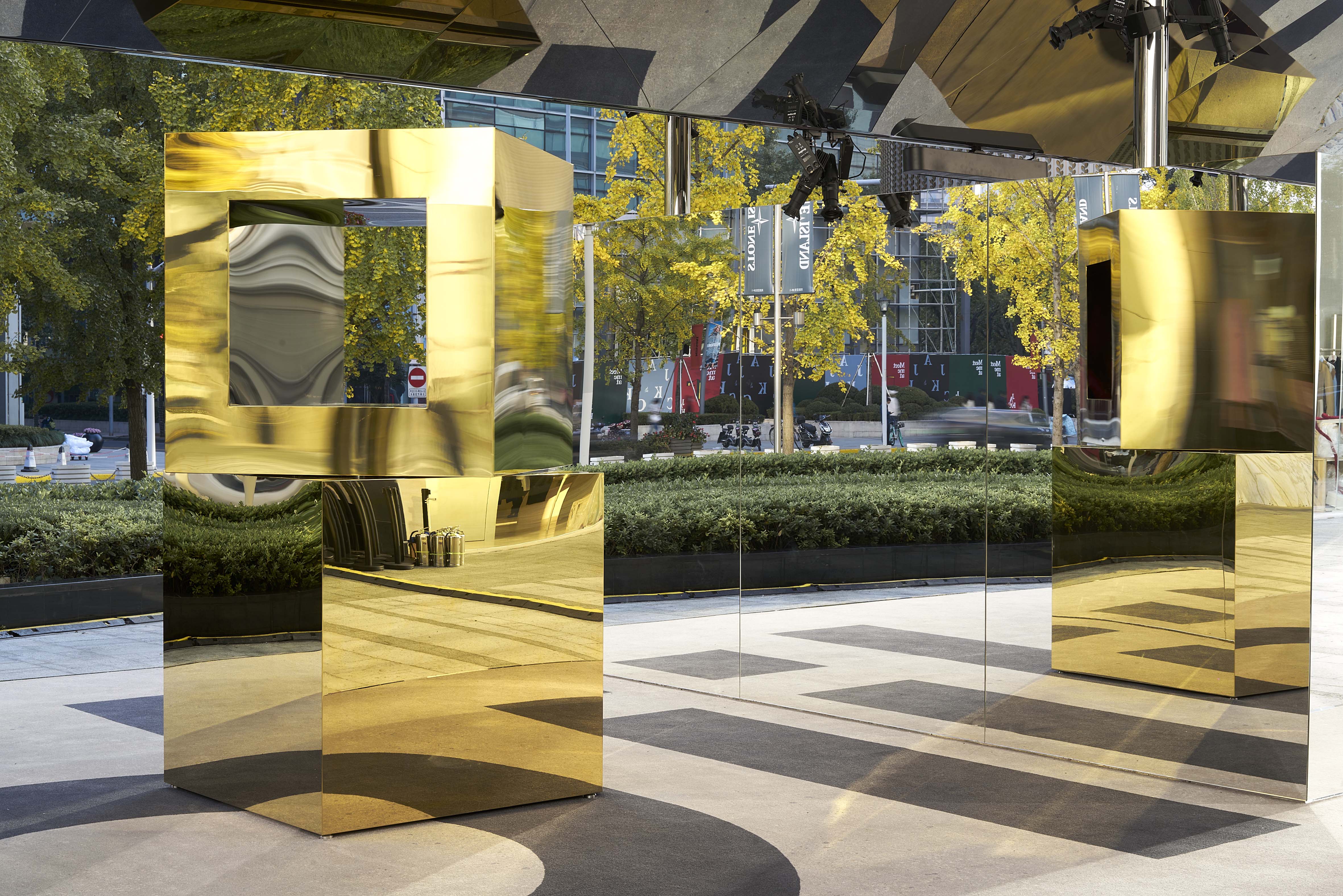 《旋转立方体2021》拓展了张鼎在2016年《旋转立方体》中使用的动态雕塑语言,呈现了四组高达两米的金色镜面立方体。在反射四周环境的同时,这些不断处于轻盈旋转动态中的厚重立方体在视觉及心理层面为观众带来错觉,制造了奇异的空间感,将观众包裹于失重、晕眩的方寸空间之中。