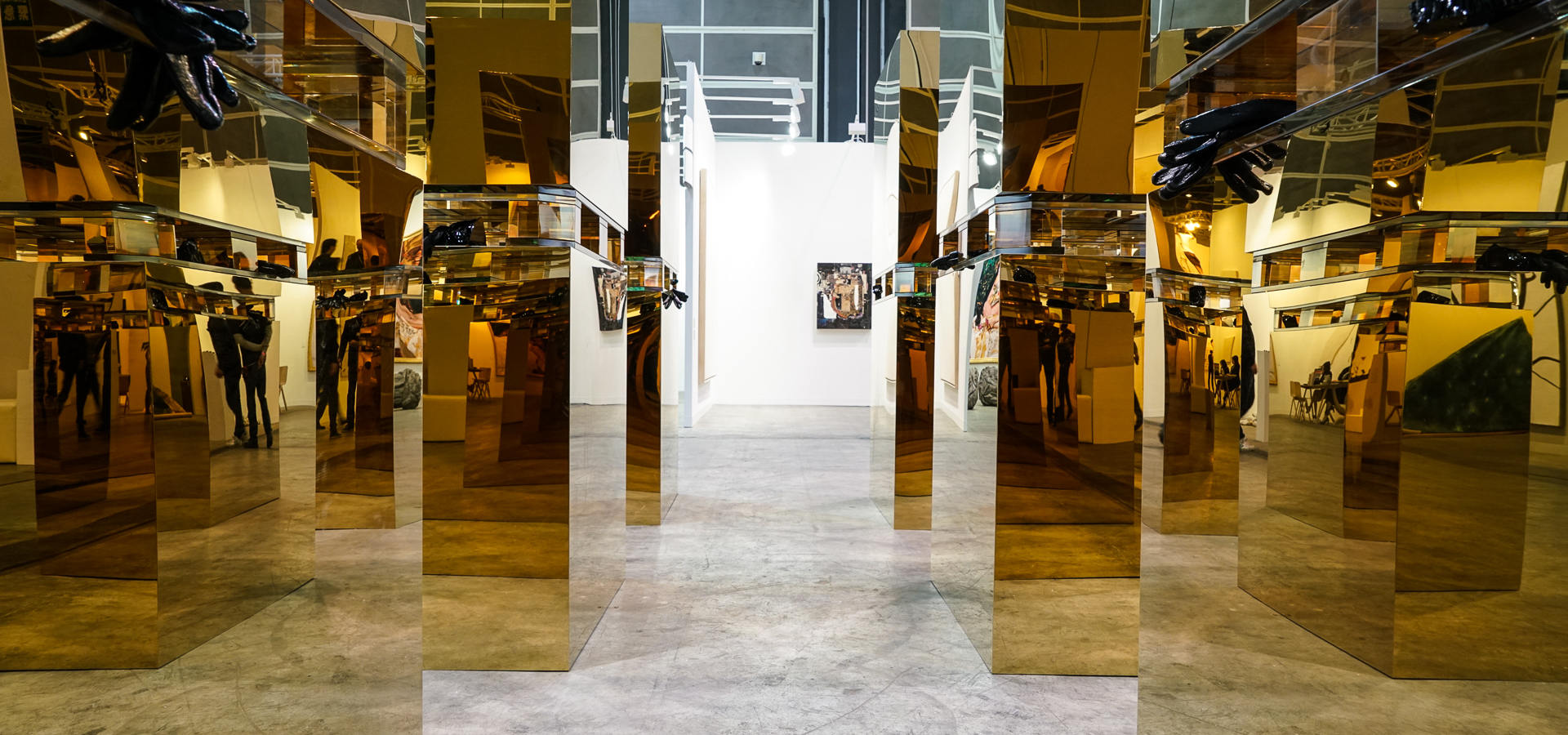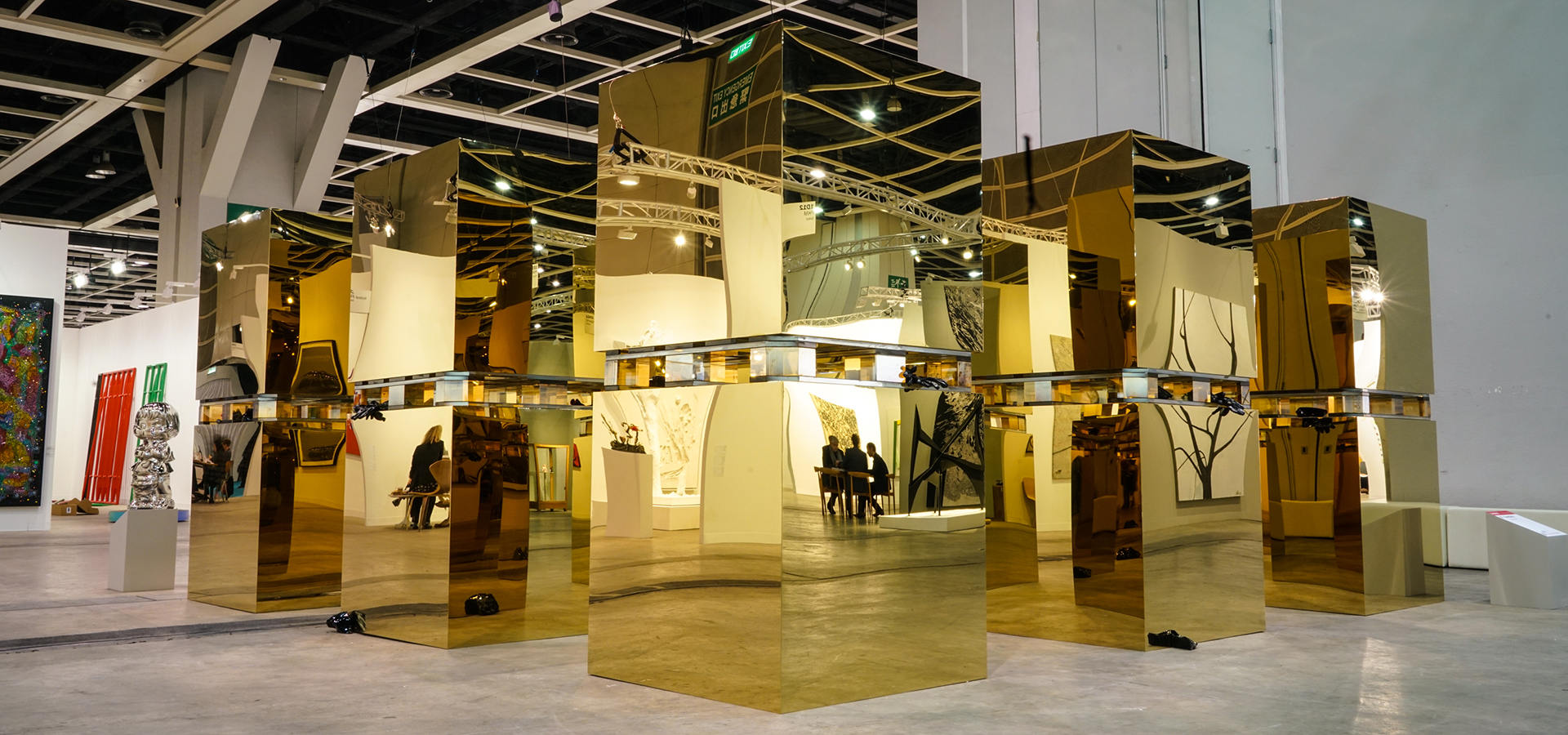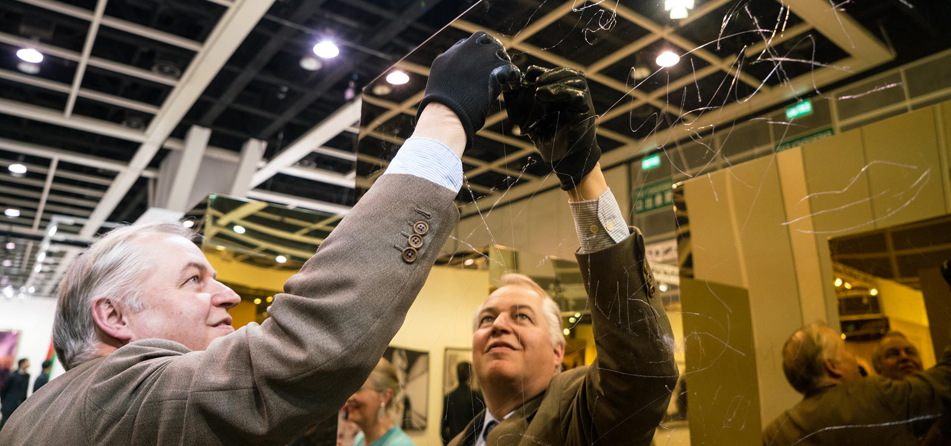 9 pairs of cubic installation are arrayed in the project 18 Cubes . Each pair consists of 2 titanium-plated cubes carried on man-made crystal pallets. During the exhibition period, visitors are invited to treat the artworks in any methods with any personal belongings or black man-made crystal provided by the artist, including but not limited to scratching, scrawling, cutting etc. It is allowed to take away the scrapings.