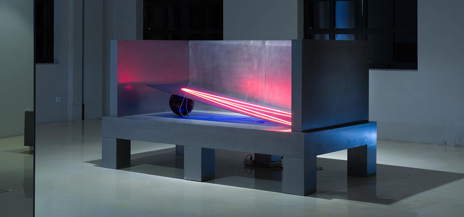 The work consists of subtransparent black glass balls and black steel panels that form a balanced space, but also dangerous, as fragile transparent dense glass and cold hard steel panel, such incompatible materials, confront each other.