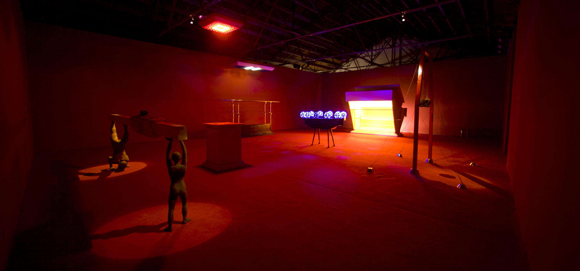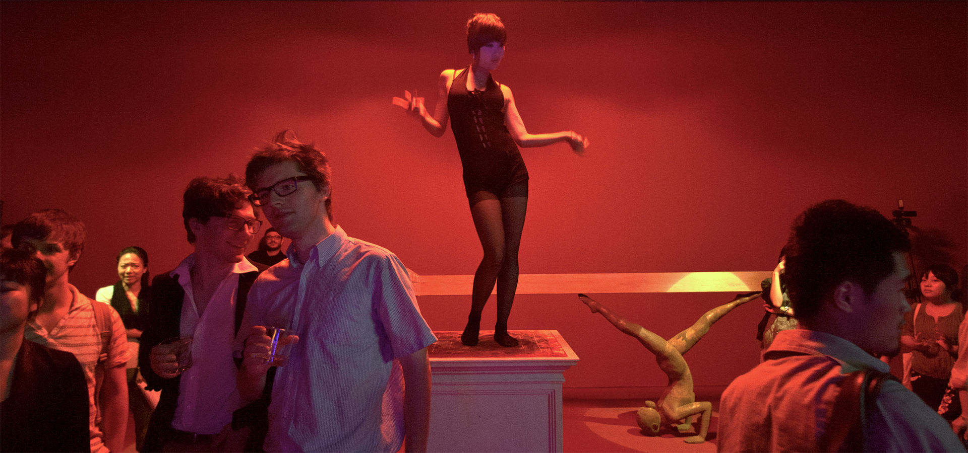 After the opening of “Opening”, one can now view two separate spaces with: a video of the lively “opening”, and an after-uproar venue, rational, and utterly classical. Marble pedestals, sculptures of young athletes and gymnastics equipment, all constitute different elements that embody “aesthetic standards” as we usually conceive them. What is interesting is that once presented, they don’t seem so “standard” anymore. The artist restructured classicism in an extreme way, but dispelled all the things around art performance; this series of installation understatedly describes today’s awkwardness on “standard”. This kind of understatement is then broken again by Zhang Ding who uses the word “Opening” as the title of this exhibition. In the society, openings are part of any event-related affairs, it is a social rule, or it is a habitual boring process with a nice show, and this illusory entertaining aspect precisely attracted the artist. In this planed, spectacular opening party, spectators participating to the violation of a cold exhibition became part of the work.