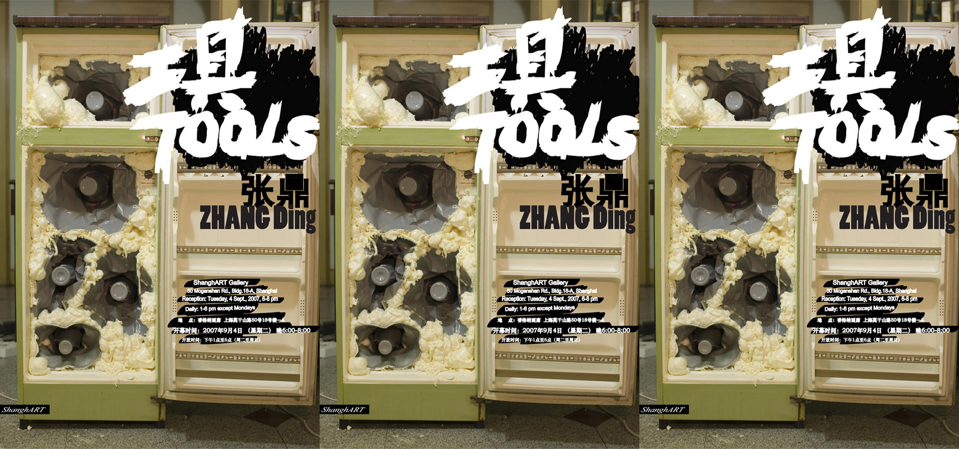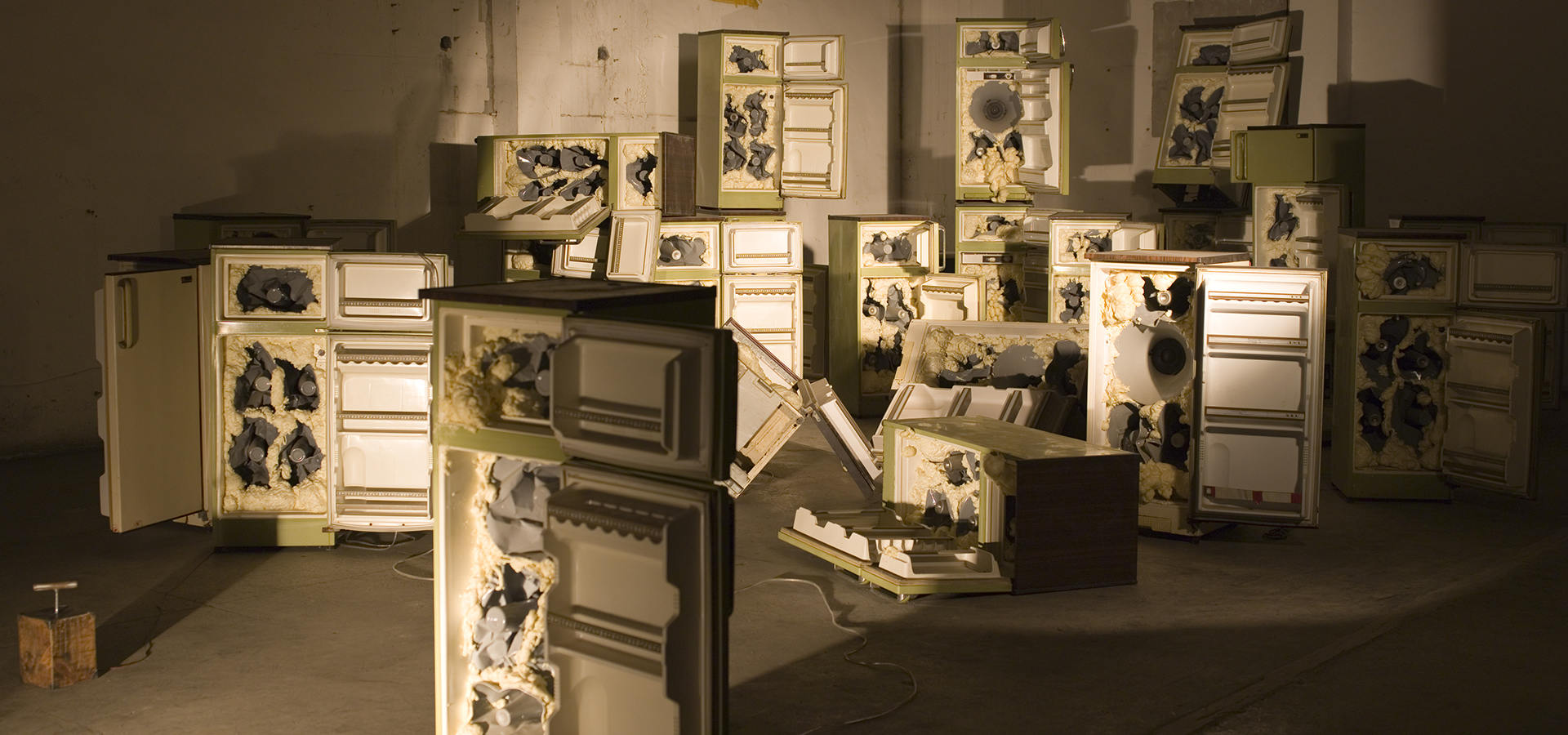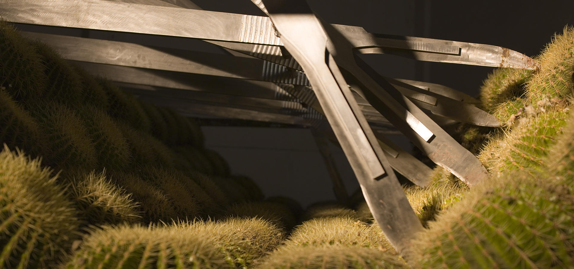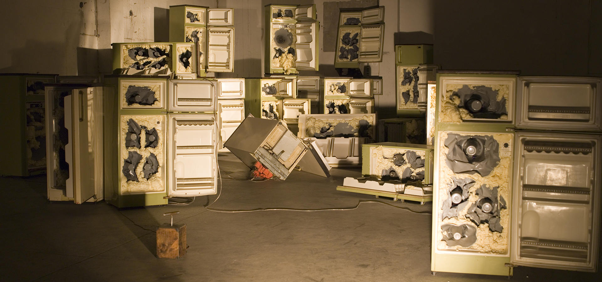 “Tools” is an allegorical fairyland to respond to this marginal world. Cactus here become the main props/tools, metaphor of a nidering and doggedly resistant life. We can see this plant anywhere, but their multiple thorns don’t allow us to approach them. Artist fights against that, trying to find the possible ways of communication with this life, using violence or dialog? Cruel beating and frozen cutting don’t destroy cactus as much as water, even though gentle and beautiful. Water pours from ten watering pots, lining out parabolas and hosing a cactus. Mud splatters around while the liquid spreads all over the floor. Beside this series of cactus is displayed a group of unnatural industrial products: 24 olive green refrigerators filled with loud-hailers, and an old style detonator which can trigger a deafening explosion noise, giving you a sudden feeling that you are in the world of the “Flowers of Evil”.