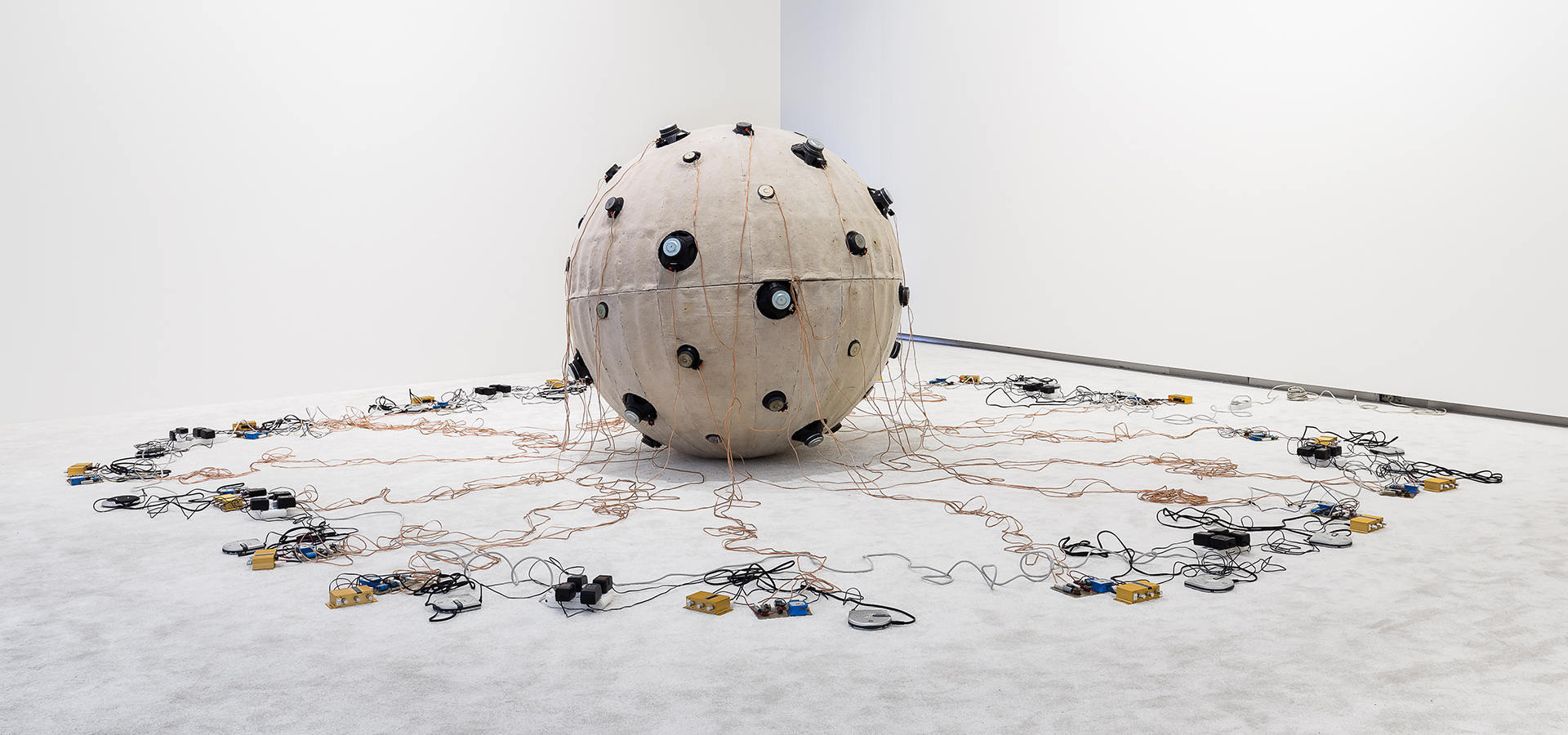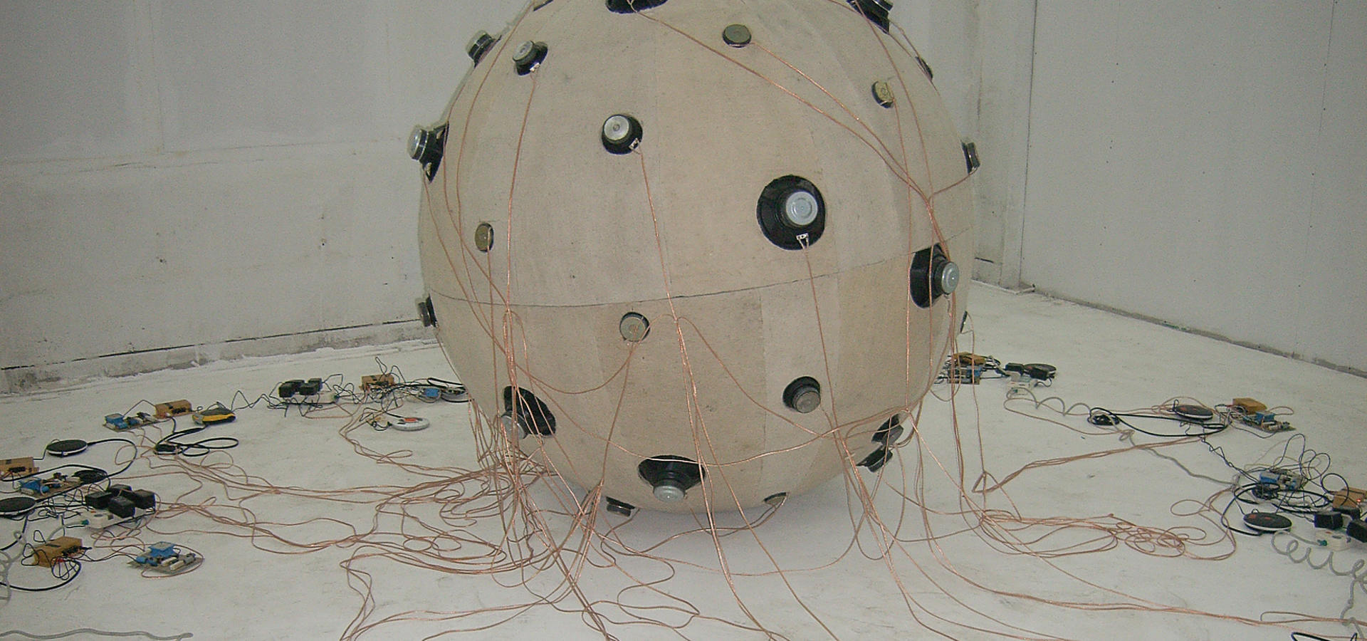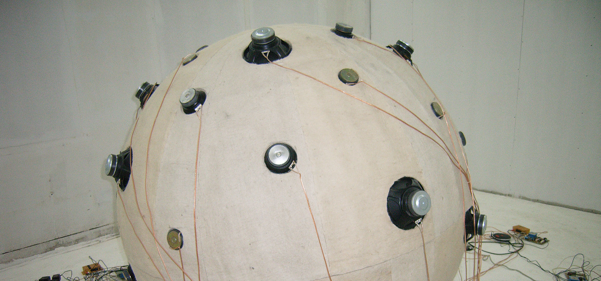 Ball covered with wool blanket, loudspeakers, wires, 16 frequency divider circuits, 16 amplifiers, 16-channel sounds, 16 CD players