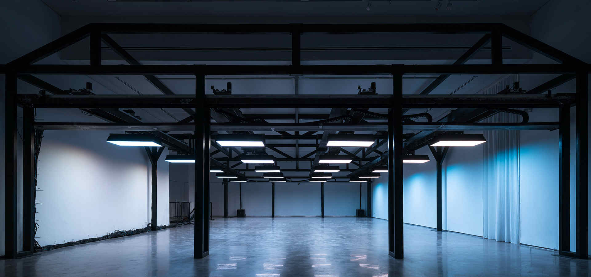 For this series of projects, the artist takes the role of a producer to establish a platform of open collaboration. After three years, he returns to the gallery, and formulates his current state as an individual artist through the creation of a solo exhibition. Zhang Ding’s 2017 solo exhibition Vortex in ShanghART Shanghai is a newly created virtual world mechanical installation. The work is 17 meters long, 11 meters wide, 4.5 meters tall and occupies the entire first floor of the gallery. 8 tracks are supported by 12 steel columns that reaches all the way up to the ceiling. Along the tracks are power generators, chains and sensors...... Automated mechanical software controls 20 pieces of 115cm by 57cm LED screens, which move along the tracks above the viewers’ heads. Four stereos are placed on four corners of the space to continually provide 4 channel sounds in synch with the mechanical movements to create a sense of movement and an invisible vastness of space.